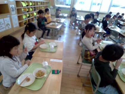 本日が1年生にとって初めての給食でした。様子を見に行くと、ほとんどの子供たちがたべきりんをしていました。感想を聞いてみると「やきそばがおいしかったよ」「もっとおかわりしたかったな」「あしたのきゅうしょくもたのしみ!」といった声が聞かれました。