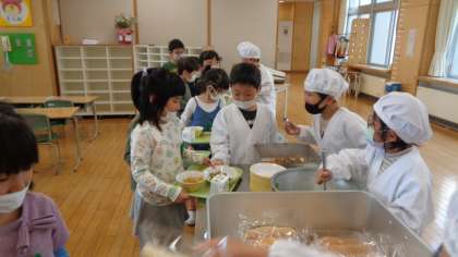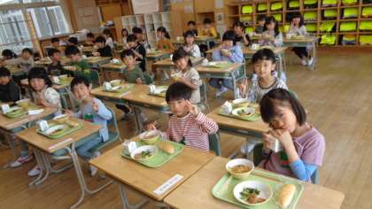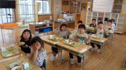今日から給食が始まりました。給食当番や、係の仕事をがんばりました。給食は、よくかんで、静かに食べました。苦手なものは食べられる分だけ食べました。片付けもしっかりできました。みんな、明日の給食も楽しみにしています。
