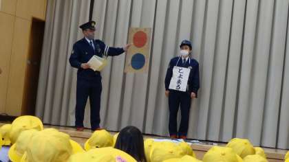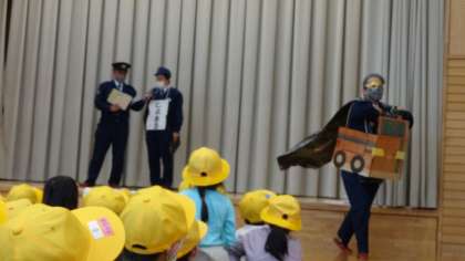 豊田交番の方による、交通安全の劇を見ました。飛び出しは危険であること、左右を自分の目でしっかり確認すること等の大切さを学びました。