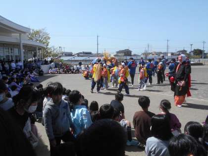 学年で地域の獅子舞を見ました。初めてひょっとこを見たり、囃子を間近で見たりした子供たちは、興奮していました。