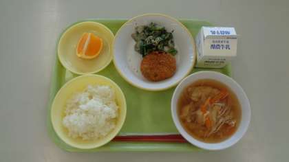 ごはん、ぎゅうにゅう、まめとかぼちゃのコロッケ、よごし、さわにわん、きよみオレンジ