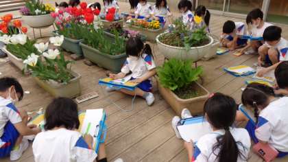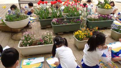 図工の時間に光庭のプランターの花をスケッチしました。4組では、「花びらはいろいろな色がまざっているね。」、「花の中に丸いつぶがあるよ。」等、花をよく見て気付いたことを話しながら、工夫して描くことができました。