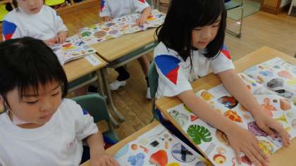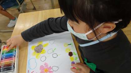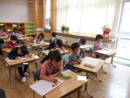 自分の好きなものをクレヨンで画用紙にかきました。友達と「なににしようかな?」と話をしながら楽しそうに活動に取り組んでいました。初めての図工の時間にわくわくしながら、教科書を開く子供たちでした。