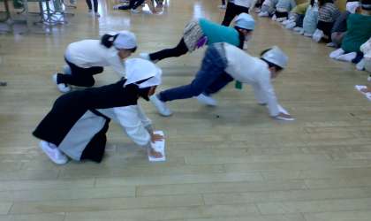 今日は、雑巾がけの練習をしました。ごみやほこりがしっかり取れるように、板の目に沿ってぞうきんで拭きました。教室がきれいになると、気持ちよく過ごすことができると気付いた子どもたちでした。