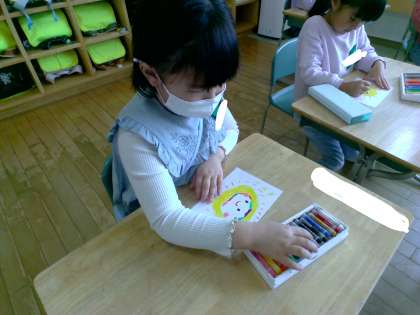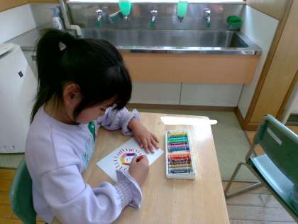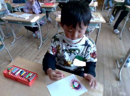 図画工作科では、クレヨンを使っておひさまの絵を描きました。自分だけのおひさまになるように、のびのびと描き表しました。