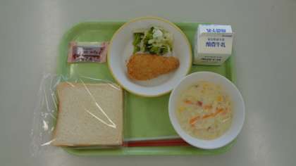 食パン、ぎゅうにゅう、サーモンフライ、ブロッコリーサラダ、クリームチャウダー、メープルジャム