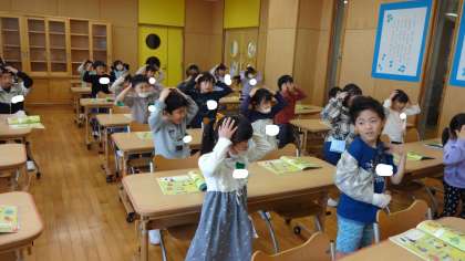 音楽科の学習では、「セブンステップス」や「チェッチェッコリ」の音楽に合わせて、簡単なダンスをしました。