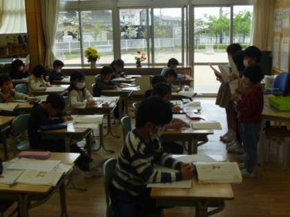 子供たちは、迷子のお知らせをするときは、ゆっくり、みんなに聞こえる声で話すこと、聞くときは、大事なことをメモをすることを意識していました。