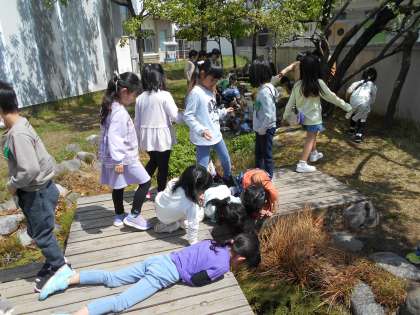 今日は天気も良かったので、休み時間にプレイグラウンドや水辺パークに出て遊びました。体を動かしたり、観察をしたりしながら有意義な休み時間を送っています。