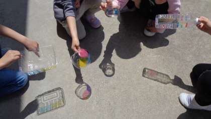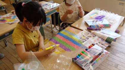図工の時間に「ひかりのプレゼント」の学習をしました。家であつめた材料にひかりを通してみると、「模様や形がはっきりうつるね!」、「地面に近づけたときと、離したときでは色が違うよ。」などと色々なことに気付くことができました。