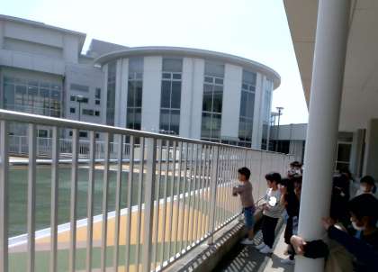生活科では、「がっこうたんけん」の学習をしています。今日はプールや放送室を見に行きました。