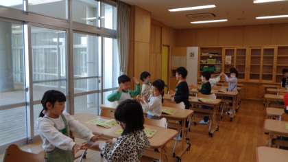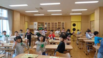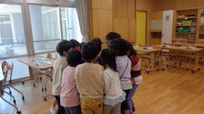 音楽では、曲に合わせて体を動かしたり、手遊びをしたりしました。