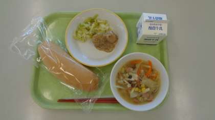 ライむぎパン、ぎゅうにゅう、フリカデレ(ドイツふうひとくちハンバーグ)、ザワークラウト(キャベツのつけもの)、アイントプフ(ぐだくさんスープ)