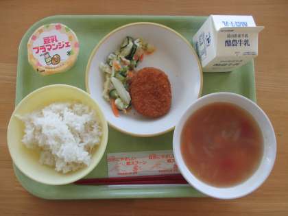 ごはん、ぎゅうにゅう、ブラマンジュ、チーズクロケット(チーズいりひとくちコロッケ)、ジュリエンヌサラダ(せんぎりやさいのサラダ)、ブイヤベース(ぎょかいのよせなべスープ)