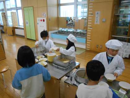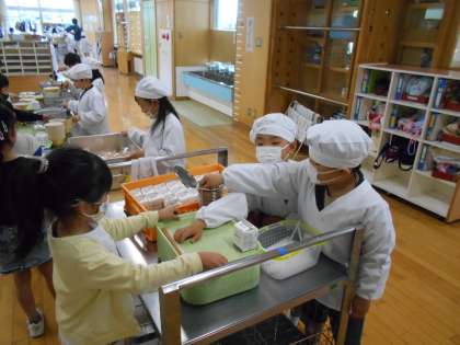 給食の準備や配膳、片付け等の仕事を子供たちの力だけで取り組んでいます。