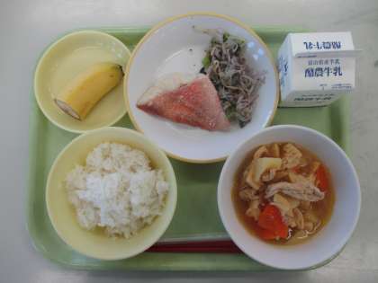 ごはん、ぎゅうにゅう、あかうおのしおやき、ゆかりあえ、ぶたにくとじゃがいものうまに、バナナ