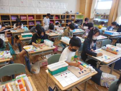 図画工作科で「コロコロガーレ」を作っています。今日は表面に好きな絵や点数などを絵の具で描きました。この後は、ビー玉がうまく転がるように考えながら釘を打っていきます。みんな出来上がりを楽しみにしながら製作しています。