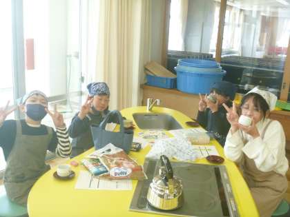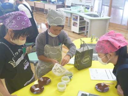 初めての調理実習でしたが、「苦いけどおいしい」、「じょうずに入れられた」など、友達と話しながら楽しくお茶を飲んでいました。