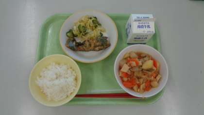 ごはん、ぎゅうにゅう、さかなのいそべあげ、あわせあえ、ちくぜんだきです。
