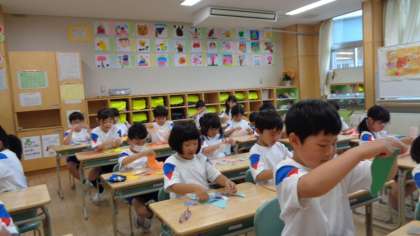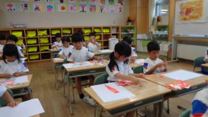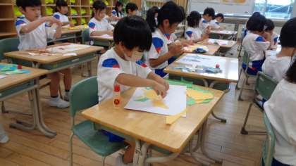 図工では、「やぶいたかたちから うまれたよ」の学習をしています。今日は、まず色紙を思いのまま、びりびりやぶきました。やぶいた形をいろいろ組み合わせ、自分が表したいものを考えました。子供たちは、想像をふくらませ、楽しみながらつくっていました。仕上がりが、楽しみです。
