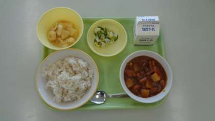 むぎごはん、ぎゅうにゅう、たべキリンハヤシ、はくさいサラダ、フルーツミックス