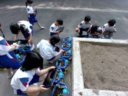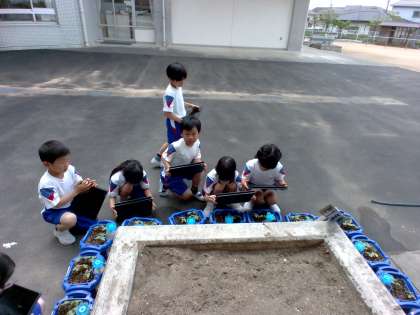 これまで水やりを頑張ってきたおかげでアサガオの芽が出てきました。クロムブックを使ってアサガオの芽を撮影し、観察しています。
