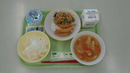 5月26日(金)の給食 公開日 2023/05/26 更新日 2023/05/26 学校からのお知らせ ごはん、ぎゅうにゅう、きびなごのさくさくあげ、いりだいずあえ、うすくずじる、のりつくだに、ヨーグルト