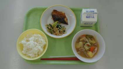 ごはん、ぎゅうにゅう、さばのしおやき、こうみやき、ぶたにくのなんばんに