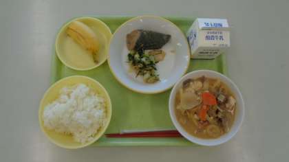 ごはん、ぎゅうにゅう、ふくらぎのさいきょうやき、こんぶあえ、にくどうふ、バナナ