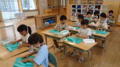 今日は、ねん土を使って学習しました。ねん土をひも状に長くのばし、いろいろな長さのひもねん土をつくって、組み合わせました。子供たちがねん土で作品をつくると、上へ上へと高くなりがちですが、工夫して平面状の作品に仕上げていたところが素晴らしいです。