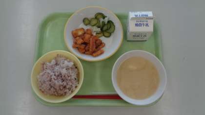 ざっこくいりごはん、ぎゅうにゅう、いかのかりんあげ、にしょくピクルス、すいとん