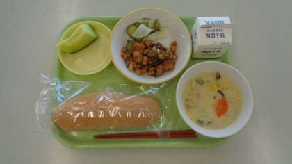 6月13日(火)の給食 公開日 2023/06/13 更新日 2023/06/13 学校からのお知らせ こめこコッペパン、ぎゅうにゅう、さかなとだいずのえごまだれからめ、メロン、かぶのサラダ、はくさいのちゅうかクリームに