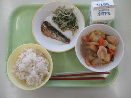 むぎごはん、ぎゅうにゅう、いわしのしょうがあじ、ほうれんそうのごまあえ、かんとうだき