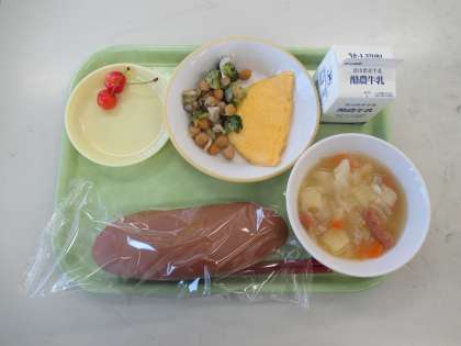 ココアコッペパン ぎゅうにゅう チーズオムレツ きのことまめのアヒージョ ポトフ さくらんぼ