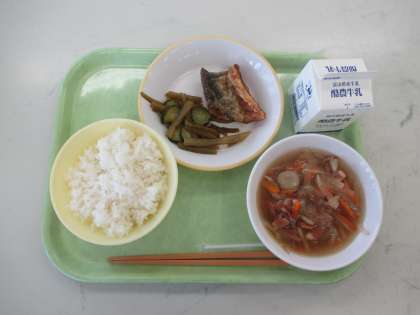 ごはん ぎゅうにゅう さかなのうめふうみかばやき くきわかめのちゅうかあえ こんさいスープ