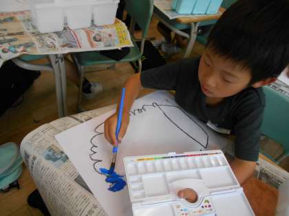 初めて水彩セットを開いた子供たちは新品の道具に大喜びでした。今日はオリジナルかき氷づくりをしました。上からおいしそうなシロップをかけて、どんどん薄くなっていく様子を表しました。