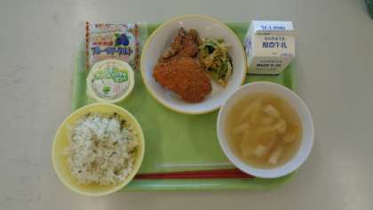 なめし、ぎゅうにゅう、ぶたにくのかおりあげ/しろみざかなのフライ、はりはりあえ、みそしる、メロンクリームソーダゼリー/ブルーベリータルト