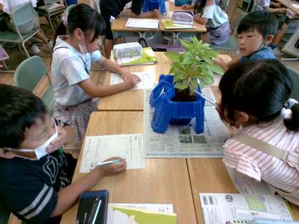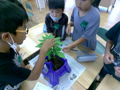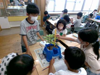 今日は育ったホウセンカの茎の高さや葉の特徴を細かく観察しました。