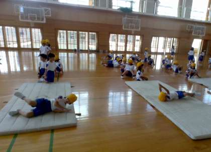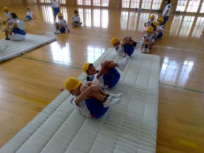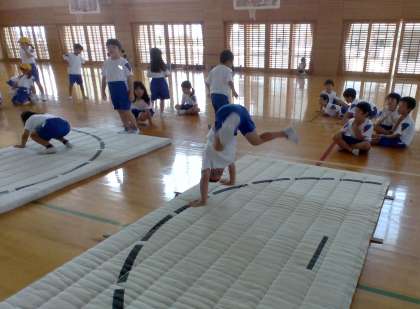 体育科の学習では、マット運動に取り組みました。ゆりかごや前転がり、カエルの足うち等、様々な動きをしました。