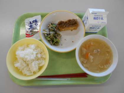 ごはん、ぎゅうにゅう、あげだしどうふのごまだれかけ、ゆかりあえ、ぶたじる、あじつけこざかな