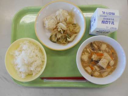 ごはん、ぎゅうにゅう、えびパオツ、バンサンスー、マーボどうふ