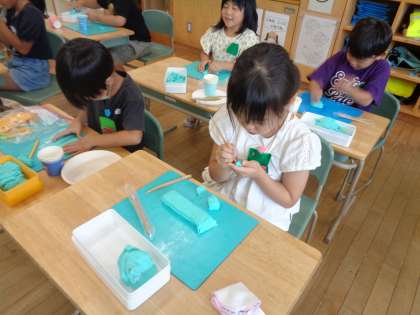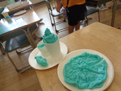 昨日の図工は、食べたいごちそうを心で思い描きながら、ねん土で形に表しました。また工夫して、紙皿や紙コップに盛りつけしました。おいしそうなごちそうが、たくさん出来上がりました!