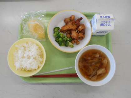 ごはん、ぎゅうにゅう、とりにくとひよこまめのあまからめ、ゆでブロッコリー、さわにわん、れいとうりんご
