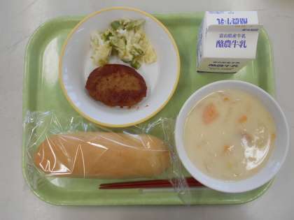 コッペパン、ぎゅうにゅう、ハンバーグのケチャップソースかけ、アスパラサラダ、ホワイトシチュー