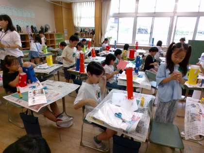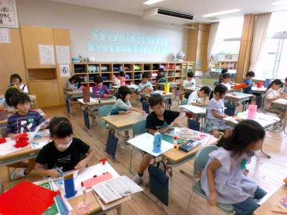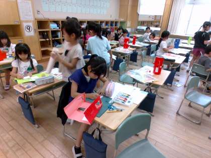 図画工作科では、「まどからこんにちは」に取り組んでいます。今日は、窓の中の飾りを折り紙や厚紙を使って細かくつくりました。