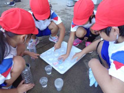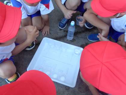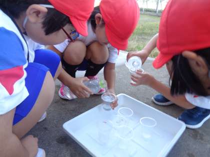 今日の算数は、2本のペットボトルに入る水の量を比べ方を考え、グループで力を合わせて実験しました。