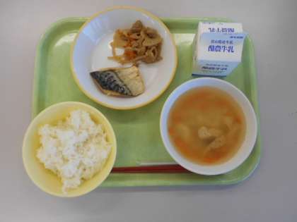 ごはん、ぎゅうにゅう、さばのしおやき、きんぴら、ごもくみそしる