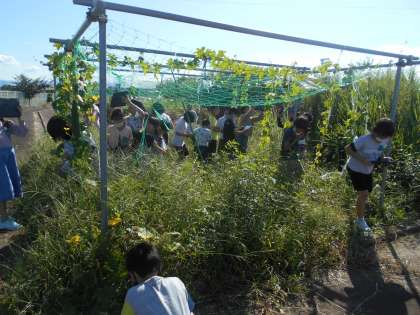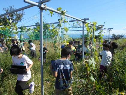 理科の学習でヘチマを見に行きました。子供たちは今の状況を「枯れているんじゃないかな」「実がなっているんじゃないかな」など、思い思いに予想しながら見に行き、たくさんの花や実がなっている様子を見て、子供たちは写真をたくさん撮り、観察カードを作りました。