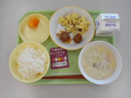 ごはん、ぎゅうにゅう、ミートボール、チーズおさつ、とうにゅうやさいスープ、かき、しそかつおふりかけ