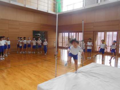高跳び運動のために、なるべく高く跳ぶ運動、ひもを飛び越える運動、跳び箱のから遠くまで跳ぶ運動など、様々な動きから高跳び運動のコツを考えながら行いました。上手に跳べたと感じる子供たちが多く、跳べるようになったと実感している子供たちでした。